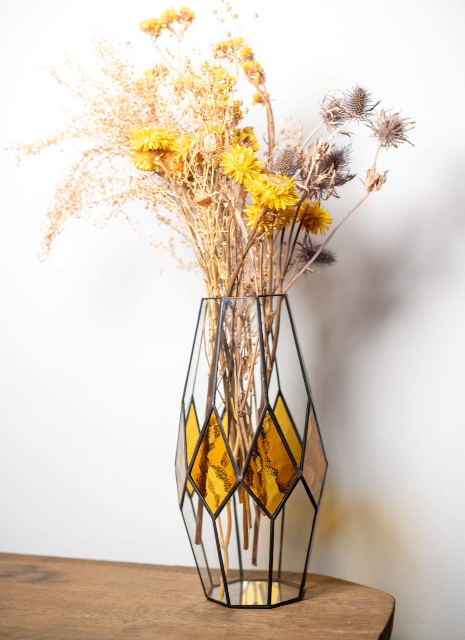 Váza je určená výhradne pre sušené kvety a aranžmány. Každý kus je originál, ktorý v sebe nesie jedinečnú kombináciu farieb, svetla a remeselného spracovania.